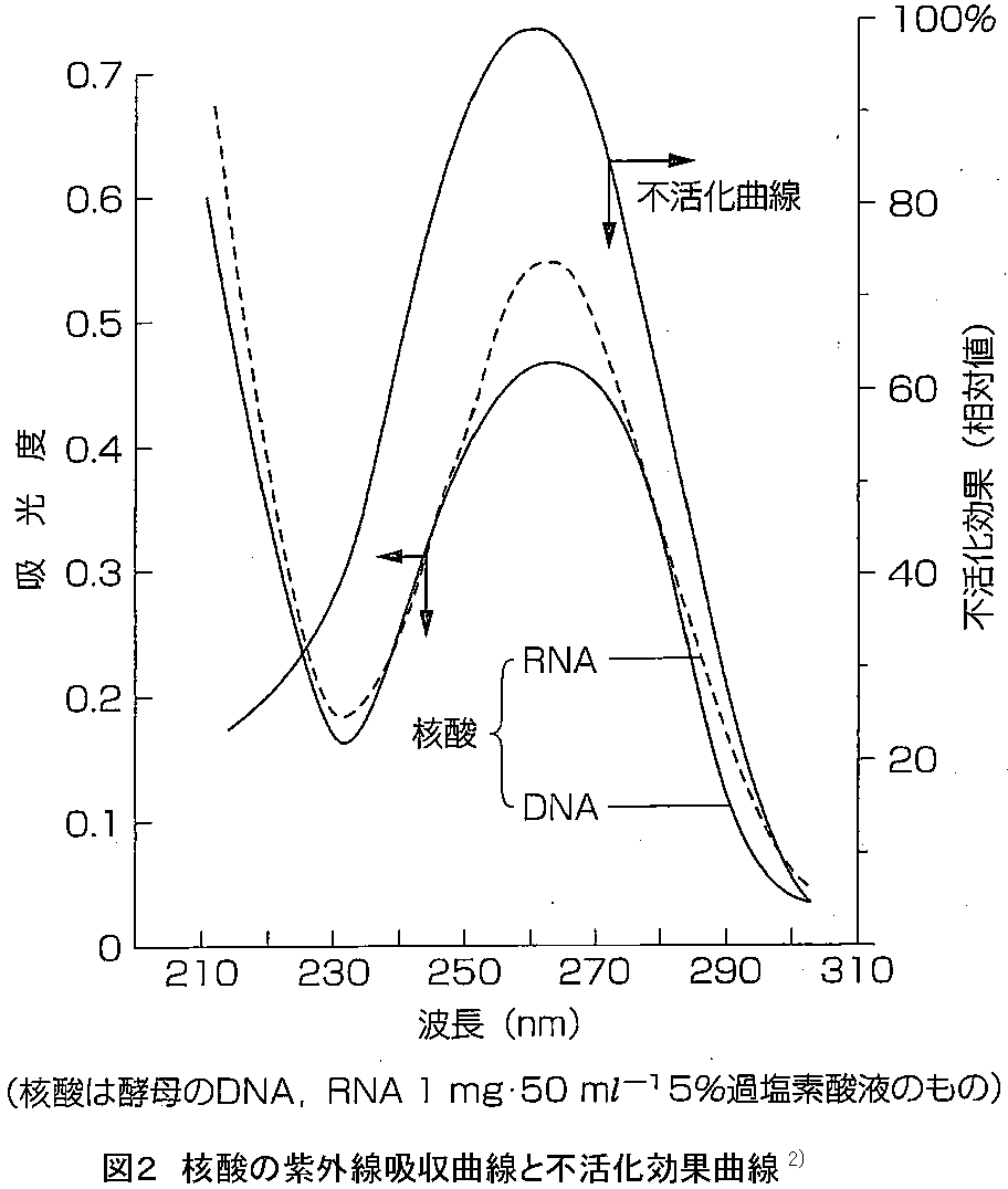 これは細胞内のDNA(核酸)の吸収極大とほぼ一致する(図2参照)波長で、紫外線の作用を及ぼす部位がDNAであることを示しています。